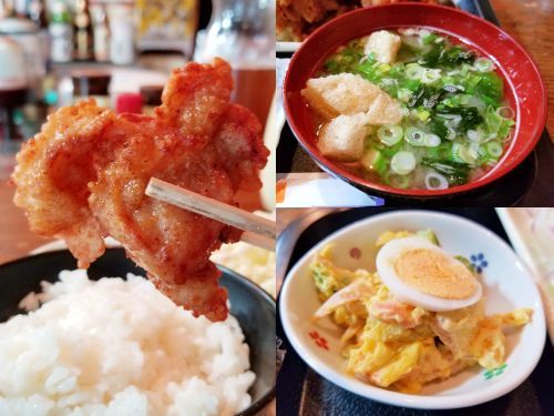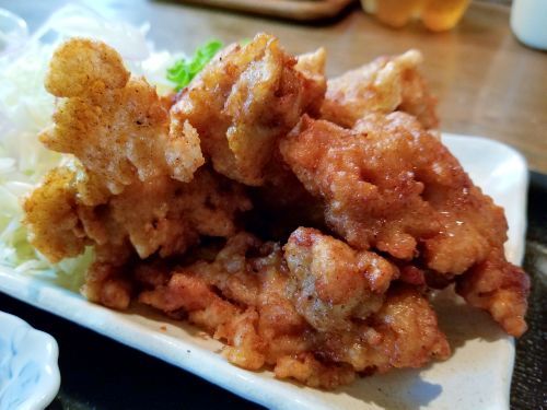 さて今日は普通の時間で午後1時過ぎ、、暖簾をくぐって入店すると、店内にはお母さんの他に男性1人と女性2人。。。うち男性は"いらっしゃい!"と言ったので、きっと店主さんなのでしょう、、、ただ酸素のボンベを使用していましたので、料理はお母さんが作るようです。。。で、今回私の注文は"若どり 唐揚げ定食"にしました、、、待つこと約8分でできあがりです。。。