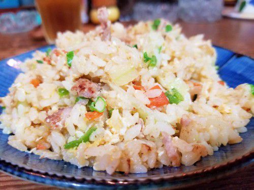 さぁ気になるお味です。。。フムフムフム、肉はハム等でなく豚肉のようです、、、一口食べると、モッチリの肉の食感とザクザクっ!? おやっ??? っと思ってよく見ると、玉ねぎ、ネギ、人参の他にピーマンが細かく刻まれています。。。ほぅほぅほぅ、ピーマン入りの"焼めし"ってちょっと珍しいかなあぁぁぁ。。。