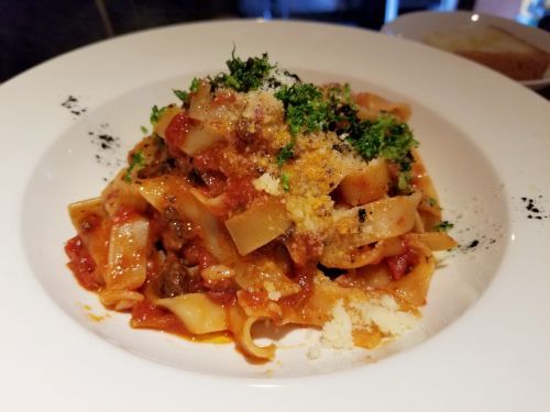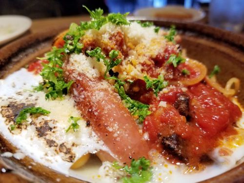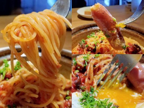 そしてミートソースの挽肉からは、山椒のようにスーっと鼻に抜けるスパイスも感じます、、、また卵も入っていて、途中で潰してスパゲティに絡めたり、ソーセージにつけたり、、、うんうん、楽しい楽しい。。。うんうん、旨い旨い~☆