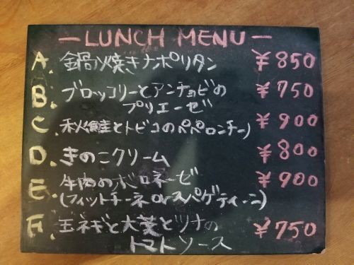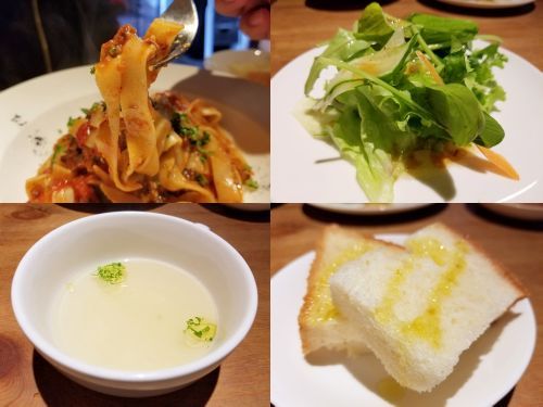 さて午後1時過ぎに我々が入店すると、ちょうど人が出た後のようで、他にお客さんはいませんでした、、、男同士でしたがテーブル席に着き、私は"鍋焼きナポリタン"を、T川君は"牛肉のボロネーゼ"を注文です。。。注文後少しして"サラダ"、"スープ"、"パン"が出てきて、、、約10分でパスタができあがってきました。。。