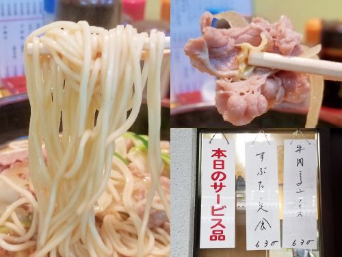 午後1時過ぎにやって来て、まずは入り口の"本日のサービス品"が目に止まります、、、おやっ!? "牛肉ラーメン"??? ほぅほぅほぅ、食べたことがないなあぁぁぁ。。。"ちびからみそラーメン"は常メニューなので次回でも食べられますが、"牛肉ラーメン"はメニュー外です、、、となると今日しか食べられないかもしれません。。。予定変更で"牛肉ラーメン ライス"をお願いすることにし、、、待つこと約10分でできあがりです。。。