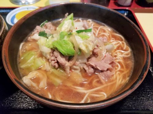 そしてトッピングは牛肉、キャベツ、玉ねぎ、ニラの炒めたものです、、、なので一般的な"スタミナラーメン"っぽい感じですねぇ。。。私は牛肉をライスに乗せて口に含み、次に麺、、、そこにスープを流し込みます。。。うんうん、旨い旨い~☆