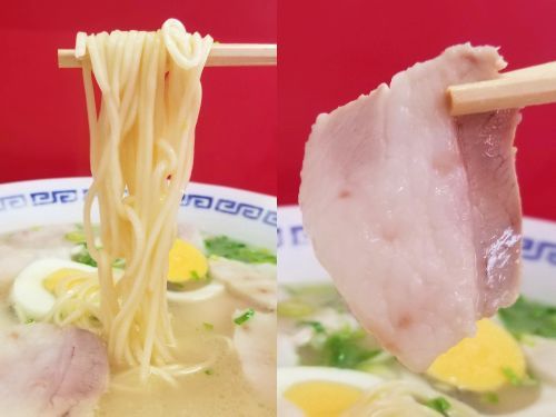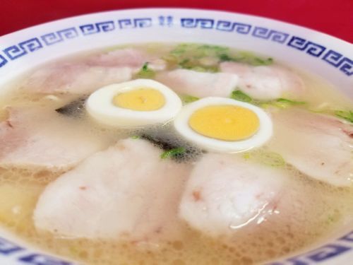 さぁ気になるお味です。。。まず麺は中細で加水やや多めのシットリ系ストレート、、、大盛なので、食べるにつれ変化するであろうとお願いした固茹でがGOODでしょう。。。そしてクセがあるけどあっさり塩味の久留米系白湯のスープ、、、今日のスープはいつもより濁りが強いようで、豚骨をプンっ!! と感じます。。。トッピングは丼鉢を覆う、薄いけどシャキっとしたチャーシューに海苔、ネギ、、、またゆで玉子は2枚です。。。うんうん、旨い旨い~☆