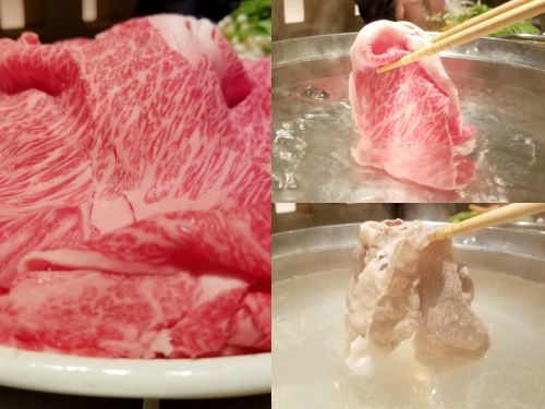霜降りの(たぶん)A5和牛を熱湯にくぐらせて、、、ごまタレやポン酢でいただきます。。。もぅ美味しいに決まっています!! うんうん、旨い旨い~☆
