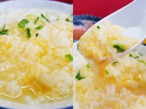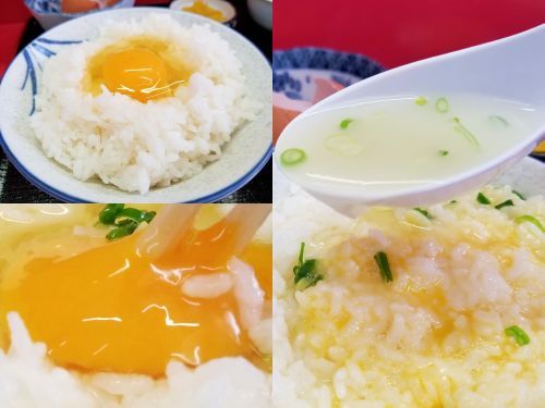 それに定食はご飯、生玉子、小鉢、漬物が付いています、、、今日の小鉢はポテトサラダでした。。。またご飯には生玉子を入れて、普通に"玉子かけご飯"にしてもいいのですが、、、今日の私の作戦は違っていました。。。まず生玉子を入れるところまでは同じなのですが、、、その後、玉子を少し潰して、その上にお母さんにレンゲをもらって、スープをかけ入れましたねぇ。。。