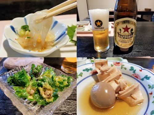 まずは前菜&刺身盛で完敗です、、、「なでしこ」さんにはサッポロの 赤星★ があるのが嬉しいんです!! おっ、もうすぐ旬の"のれそれ"があります、、、"のれそれ"とは、アナゴの稚魚のことで、ポン酢でチュルンといただきます。。。