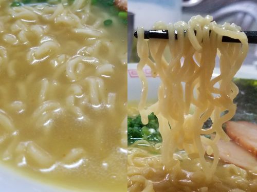 さぁ気になるお味です。。。まず麺は少しグミ系食感のインスタント縮れ麺、、、でも短いですネっ!! 海外向けなので短いのか、それとも長旅で砕けて短くなったのか!? まぁどちらにしても啜るほどの長さではありません。。。そしてスープは、、、おやおや??? 鶏ガラ系と言うよりは、スパイシーなカレー風味です!! その中にわずかに鶏ガラっぽさを感じます。。。うんうん、旨い旨い~☆