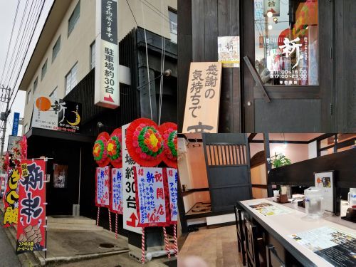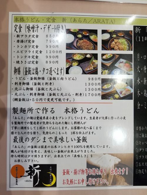 今日のお昼は、昨日の3月4日(日)に馬越町オープンした、うどんお食事処の「新 -ARATA-」さんです、、、この場所は少し前まで焼鳥屋さんだったところです。。。昼は本格うどん御食事処、夜は美味いが集う専門店というコンセプトのお店ですが、「 HUGU 」のレストラングループの「 新 -ARATA- 」さんと関係があるのかどうかは???です、、、でもロゴがちょっと似ていますねぇ。。。
