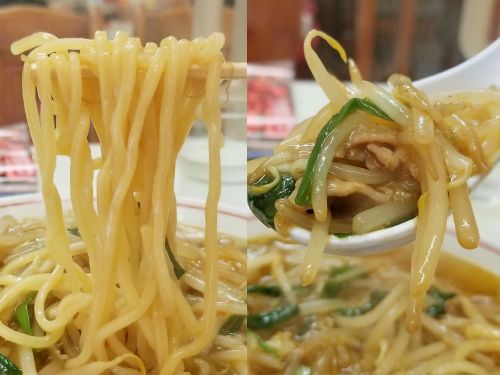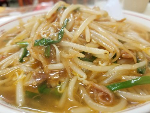 さぁ気になるお味です。。。まず麺は中太で加水やや多め、黄色い緩やかウェーブタイプです、、、グミ系のクニュクニュっとした面白い麺ですねぇ。。。そしてスープは、おそらく鶏ガラ出汁系で醤油味の中華スープでしょう。。。その上にもやしとニラ、豚肉が甘辛い餡かけでトッピングされています、、、その餡のピリ辛と甘みがスープに溶け込みコクを出していますし、シャキシャキのもやしの食感もGOOD!! また餡の効果で身体もポっカポカになりました。。。うんうん、旨い旨い~☆