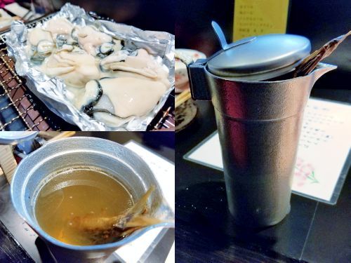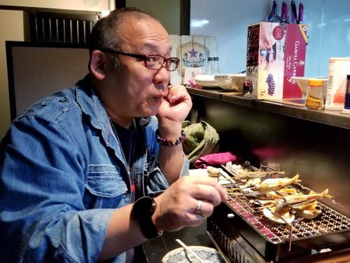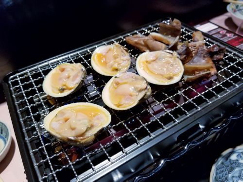 と、ここでぢょにサンが、卓上の網焼き器を用意してもらい、"ホンビノス貝"や"鮎"を焼き始めました、、、キャンプ道具に凝っているぢょにサン、、、とっても楽しそうです。。。