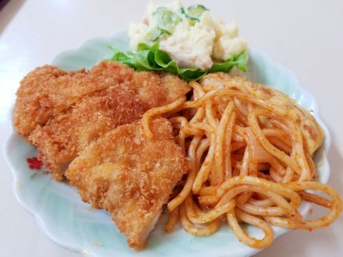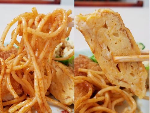 "おかず"の内容は、チキンカツ、スパゲティ、玉子焼、ポテトサラダです、、、その中でチキンカツだけを残し、他を食べながら待つこと約4分、"カレーうどん"のできあがりです。。。