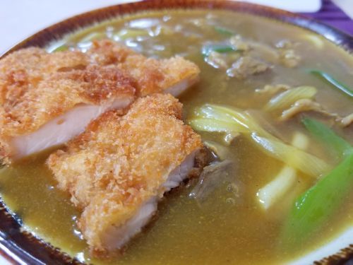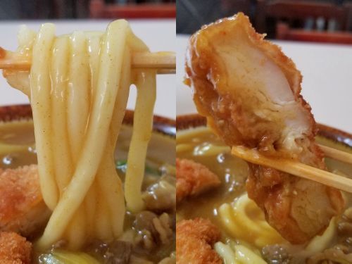 で、残しておいたチキンカツをトッピング、、、さぁ気になるお味です。。。まず麺は中細で、BARI食堂風のコシ抜けフニャフニャ麺、、、箸で切れそうなくらいの柔らかさです。。。そしてカレーは出汁入りで、カレー粉と片栗粉でトロミをつけたタイプ、、、 私はこのタイプが大好きなのです。。。