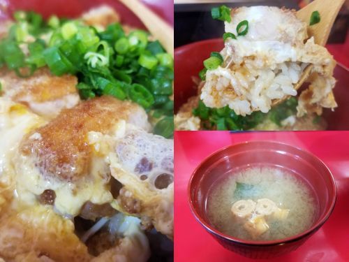 で、食券制は変わらないので、私は"かつどん(卵)"を買い席に着きました、、、そして待つこと約4分、"みそ汁"付きでできあがりです。。。