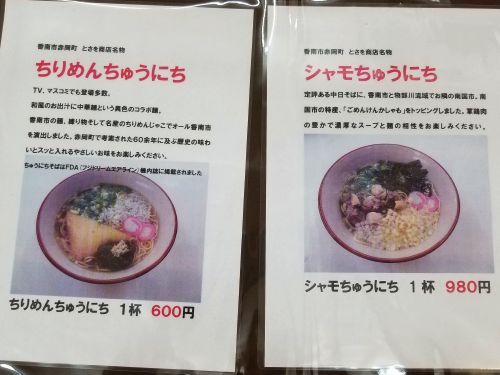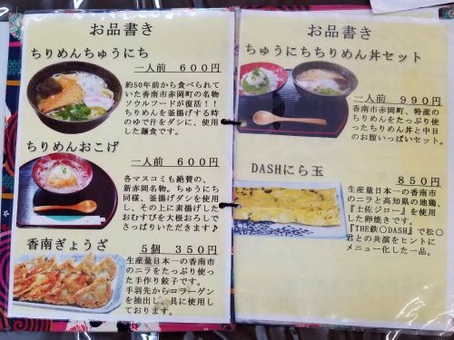さて席に着いた我々はメニューを拝見、、、当初、私は定番メニューの"ちりめんちゅうにち"にしようと思っていたのですが、"シャモちゅうにち"の方が気になってしまったので、そちらにすることにし、のりライダーは"ちりめんちゅうにち"、ぢょにリーダーと義兄弟は、"香南ぎょうざ"と"DASHにら玉"になりした。。。そして待つこと約12分、、、注文のできあがりです。。。