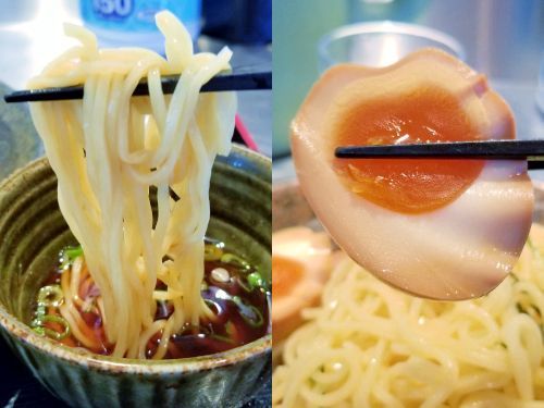 さぁ気になるお味です。。。まず麺は中細で四角い断面、加水やや多めの黄色い緩やかウェーブタイプです、、、ゆで加減は固めの上、よく冷やされているので、シコシコの強い弾力がGOODでしょう!!