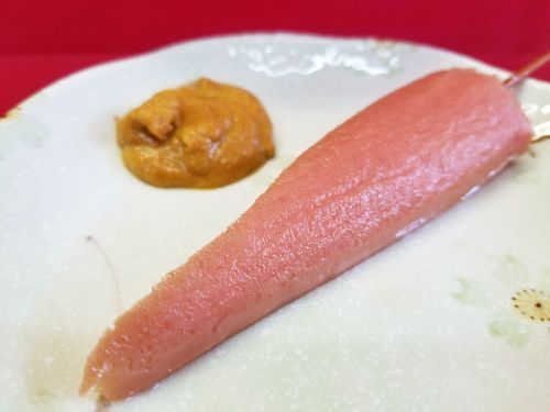 さて午後10時20分頃に暖簾をくぐると、店内にはテーブル席にお客さんが一組、、、あれっ!! 後輩君ですねぇ。。。(笑) 一人の私は"冷麺"を注文して、"おでん"を1本取ってカウンター席に着きました。。。