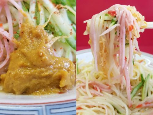 毎回"冷麺"の時は"おでん"を1本取りますが、本来"おでん"が目当てでなく、"練辛子"の方なんですねぇ、、、でも"おでん"も取らずに"練辛子"だけいただくのは、さすがに気が引けちゃいますから。。。やがてその"おでん"を食べながら待つこと約5分、、、"冷麺"ができあがりました。。。