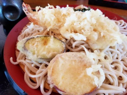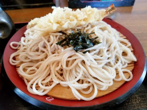 さて午後1時20分頃に暖簾をくぐりました、、、店内には2人のお客さんが座っています。。。私は一人なのでカウンター席に着き、今日も暑いので"天ざる"をお願いしましたねぇ。。。やがて待つこと約7分、、、蕎麦の上に天ぷらがトッピングされた、昔ながらのスタイルでできあがってきました。。。