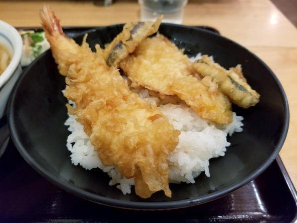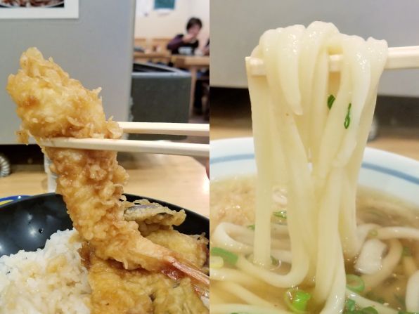 午後1時半過ぎの少し遅い時間でしたが、店内はそこそこ混んでいます、、、一人の私は空いていたカウンター席に着き、"天丼定食"を"うどん(温)"でお願いしました。。。そして待つこと約6分、、、注文のできあがりです。。。