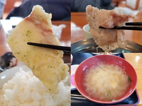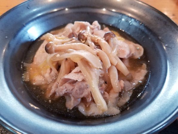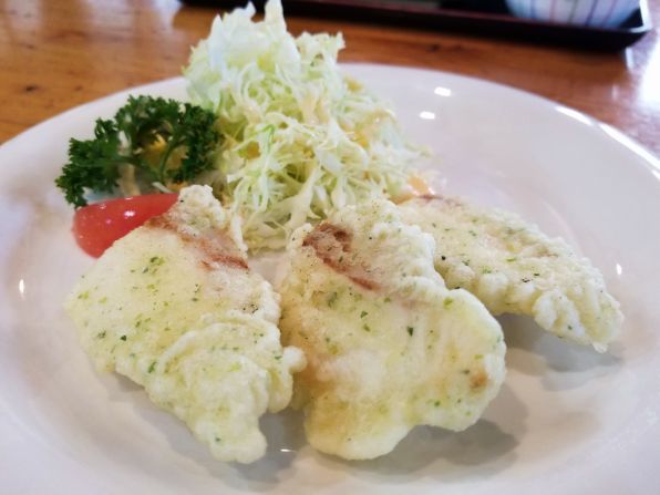 さぁ気になるお味(日替り定食)です。。。メインのおかずは二種、、、"真鯛の磯辺揚げ"と"豚ときのこの炒め煮"でしょう。。。"真鯛の磯辺揚げ"はホクホクの身がGOOD!! そして"豚ときのこの炒め煮"も白いご飯によく合います。。。