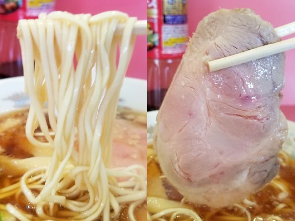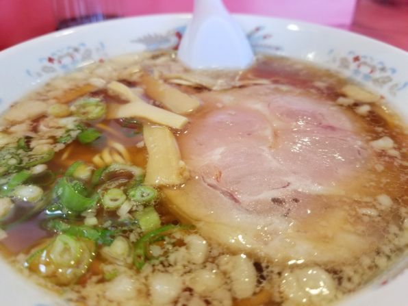 さぁ気になるお味です。。。まず麺は、前回食べた定食では、細いウニウニ縮れタイプでしたが、今回の単品ではやや細目の平打ちで、ほぼストレート、、、加水はやや少なめで、しっかり固茹ででしょう。。。シコシコの食感がGOOD!! そしてスープは鶏ガラ+魚介系の醤油味、、、尾道ラーメンのタイプですが、醤油の味が比較的アッサリです。。。そこに表面に浮かぶ背脂のコクが加わります!!