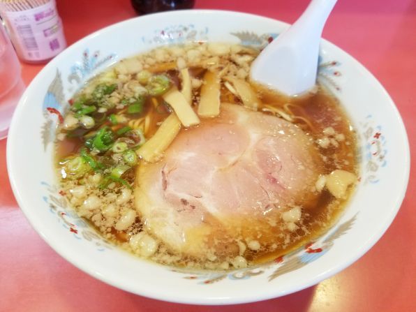 さて暖簾をくぐったのは午前11時40分ころ、、、お昼前ですが店内は混み合っています。。。我々はカウンター席に着き、(朝からかなり食べているので)"ラーメン"を単品でお願いしました。。。やがて待つこと約3分、、、アッという間にできあがりです。。。
