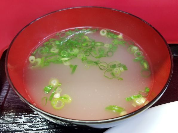 そしてクセがあるけどあっさり塩味の、久留米系白湯のスープが付いているのがGOOD!! この"焼めし"との相性がバッチリです。。。私はいつも半分をいただいたあたりで、備付のソースを廻しかけます、、、うんうん、この味変も好きですねぇ。。。うんうん、旨い旨い~☆