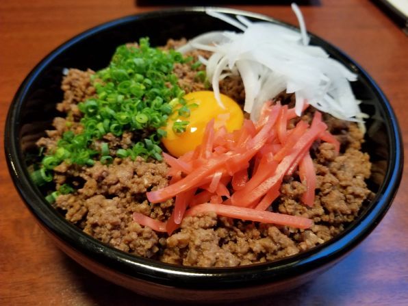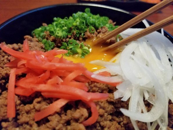さぁ気になるお味ですが、"極旨のローストビーフ丼"に関しては、 前回記事 をご参照ください、、、今回は"極上の金のたまごめし"です。。。おおぉぉぉ、プルプルンとした牛そぼろ肉が、丼の表面を覆い尽くしています、、、そのそぼろ肉は、ふだん焼き肉として使用しているヒレ、ロース、ランプ、タン等々。。。なんて贅沢なのでしょう!! トロ~リの卵黄を潰して、特製のほんのり甘いタレで煮込まれた肉に絡め、玉ねぎ、ネギ、紅生姜もろともガツガツと口内に流し混みます。。。うんうん、なんて男らしい!! うんうん、旨い旨い~☆