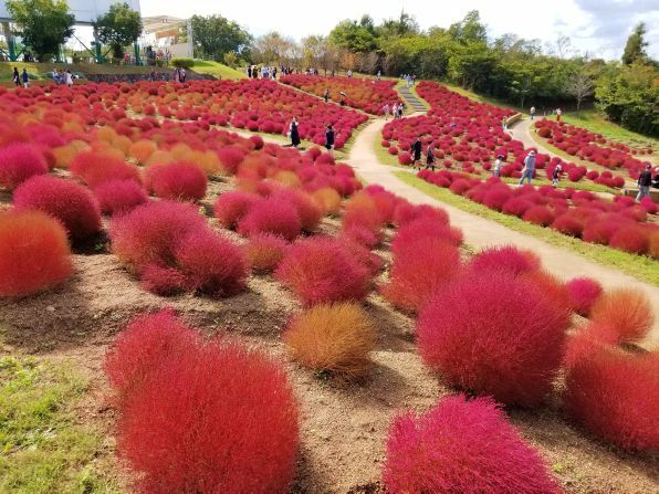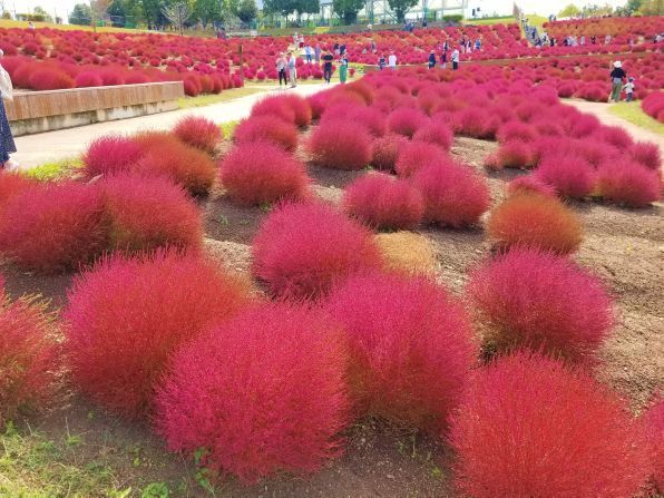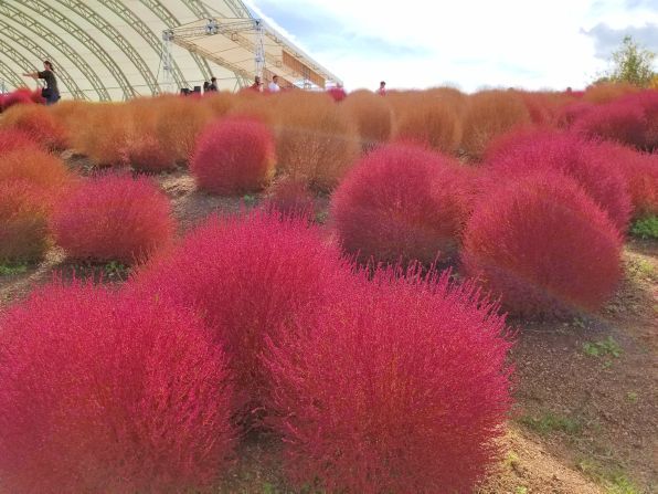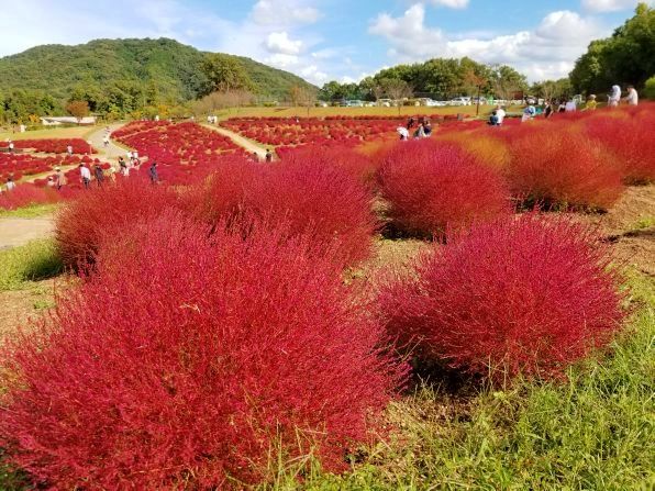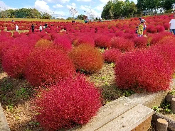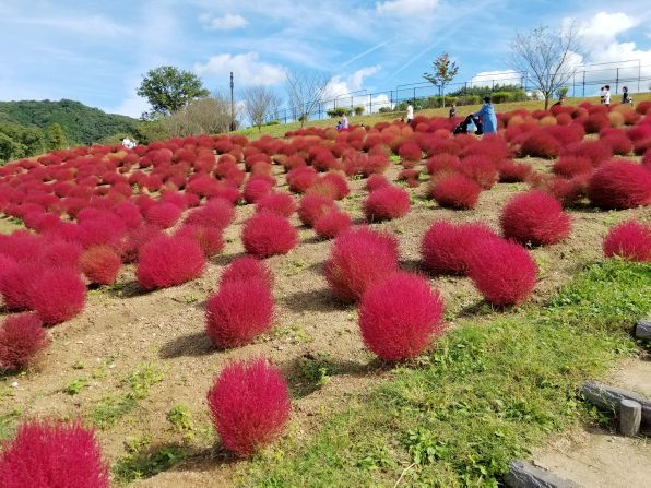 HPの 紹介 によると、、、『「ホウキグサ」「ホウキギ」という和名で呼ばれています。昔、枝を乾燥してホウキに利用していたことに由来します。8月に鮮やかな緑色をした葉っぱが9月中旬頃から紅葉する様子が美しく絶景です。実は秋田県の郷土料理にもなっている“とんぶり”の原料で、「畑のキャビア」と呼ばれています。(※本公園のコキアは観賞用の品種です) 園内では花巡りの丘で4千本がご覧いただけます。』と言うことです。。。
