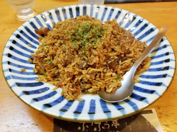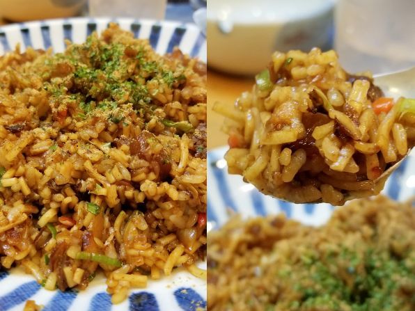 そして満を持して、今回は"そばめし"も初注文しました、、、するとカウンター前の鉄板でK川君が、シャカシャカと一心不乱にヘラで麺を切ってくれています。。。で、そのお味は、、、ほぅほうほぅ、肉は豚肉でなくプルルンっとしたすじ肉が入っています。。。またシャカシャカ切ってくれた麺は、米粒と同様のサイズで、両者がフワフワっと絡み合います、、、そこに絡んでいるのはピリ辛いドロソースっ!! うんうん、これは噂に聞いた神戸市の長田区発祥の"そばめし"っぽいタイプでしょう。。。うんうん、旨い旨い~☆