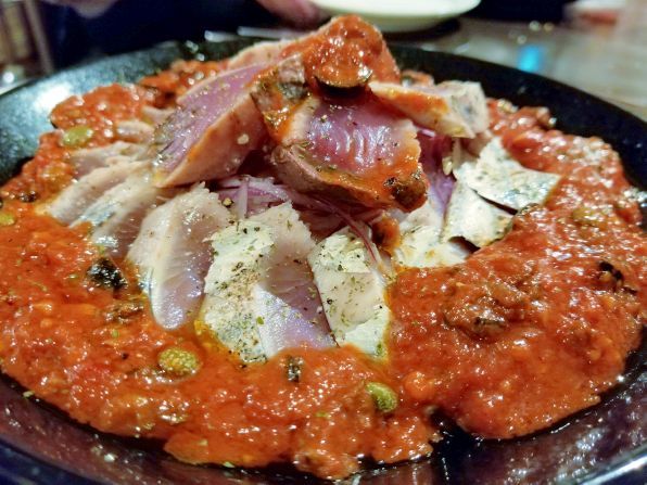 さて料理はサーモンや生ハム、またイチジクや柿、リンゴなどのフルーツ系の前菜から始まりました、、、そして"戻りカツオのゴッソーヤ風"などなど。。。白ワイン系の料理ですが、私は赤でいただきます、、、うんうん、ワインが進君!!
