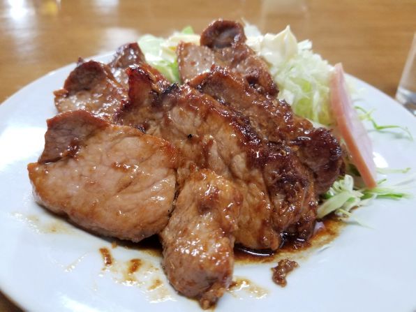 午後2時前に暖簾をくぐると、店内にお客さんは一人です、、、私は空いていた席に着き、"豚生姜焼き"+"ライス小"をお願いしました。。。今日は何だかガッツリと肉が食べたい感じだったのです、、、やがて待つこと約8分で、注文ができあがりました。。。