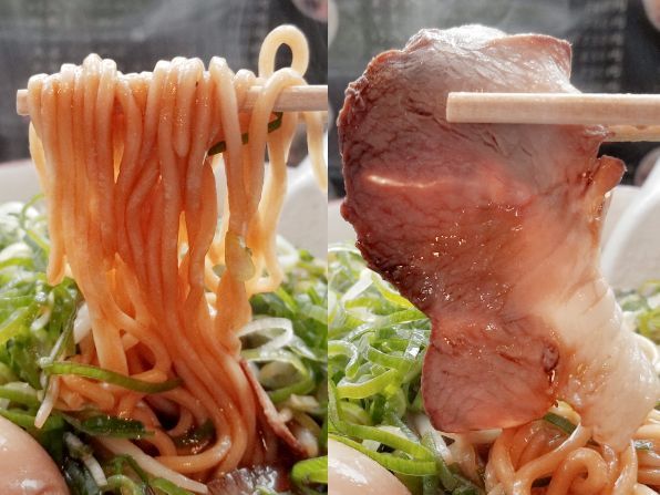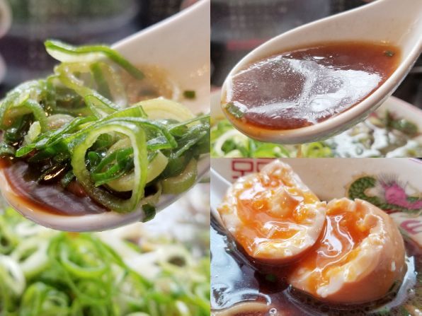 そしてスープは豚骨ベースの濃い醤油味、、、表面には白濁がありますが中のスープは濁っていません。。。基本的には醤油味の清湯スープですが、、、醤油ダレに煮豚を作ったあとに残る煮汁が加えられているため、スープの色は非常に黒くて香ばしく、独特のコクがあるのです。。。