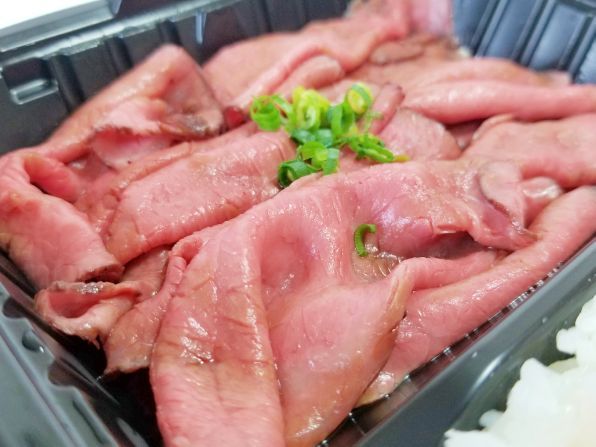 と言うことでお家でなく、お店(自店)でお店ごはんです。。。持ち帰り用の容器には、テラテラとピンクに光るローストビーフが並べられています、、、そのの隣にはタレのかかったライスです。。。ローストビーフを一枚取って、ライスをおにぎりのように巻いていただくのです!!