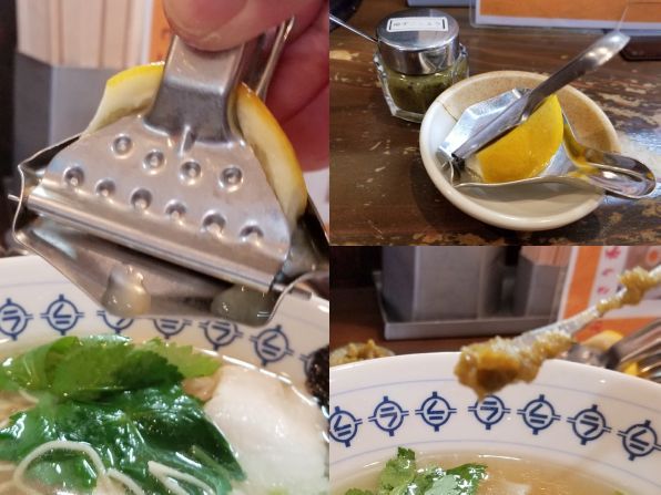 私はまずスープ本来の味で楽しみ、半分位食べたところでレモンを絞って酸味を追加、、、さらに3/4を食べたところで柚胡椒を入れて、味にアクセントを加えます。。。三種類の味を楽しんだ上、"ロカボ麺"なのでヘルシーヘルシー!! うんうん、旨い旨い~☆