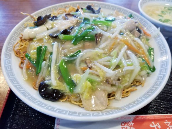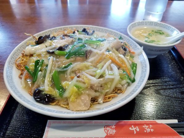 私は空いていたテーブル席に着き、メニューを確認、、、ほぅほぅほぅ、"広東風オムそば"、、、見慣れないメニューなので、コレにしましょう。。。やがて待つこと約6分、、、"広東風オムそば"のできあがりです。。。