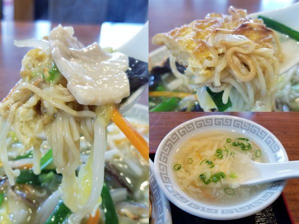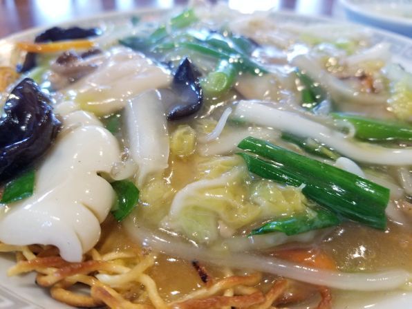 さぁ気になるお味です。。。まず見た目は"餡かけ堅焼きそば"、、、どこら辺がオムなのでしょう。。。と、麺を餡から引き上げいただくと、、、あれっ!? 麺は堅いけどフワっとした卵の食感があります。。。なので麺をよく見ると、おおぉぉぉ、麺の下に卵が張り付いています!!