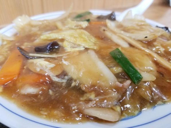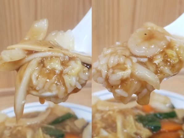 さぁ気になるお味です。。。丼の表面を覆うように、トロ~っとした卵入りの餡がかかっています、、、その餡に綴じられた具材は豚肉、むきエビ、イカ、マッシュルーム、白菜、筍、玉ねぎ、人参、キクラゲ、ネギなど盛りだくさん、餡も中華スープで醤油味でしょう。。。でもこの時期、アツアツの餡は発汗エネルギー源です、、、額から汗が流れ出しましたねぇ。。。うんうん、暑い暑い、、、うんうん、旨い旨い~☆