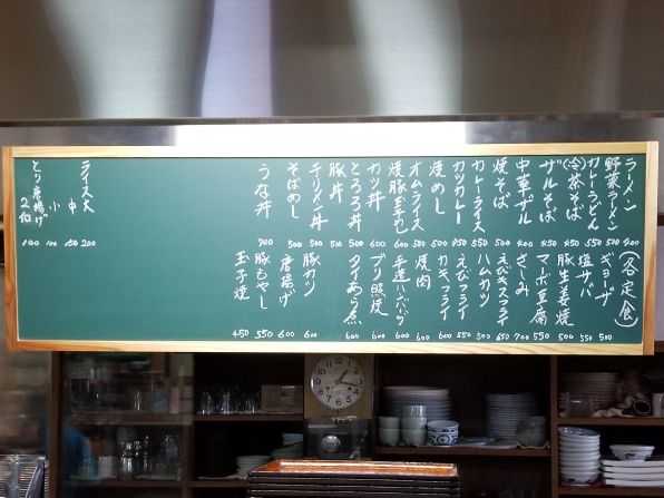 午後1時15分頃に入店すると、カウンターには3人、座敷席に2組み位のお客さんです、、、私はちょうど空いたカウンター席に着きました。。。おやっ!? メニューの黒板が変わっています、、、前より長くなり、ホワイトボードに足されていたメニューも入りました。。。