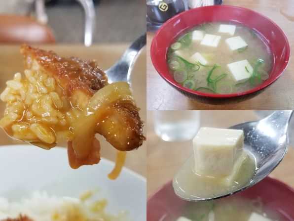 またカツは揚げたての、衣がサックサクでGOOD!! そしてナゼか鰹風味プンプンの"味噌汁"が付いてきます、、、豆腐が入った"味噌汁"付きの"カツカレー"は、他店にはありませんネっ!! うんうん、旨い旨い~☆