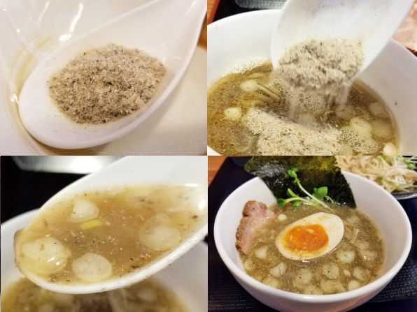 そして鶏ガラ+魚介の定番スープに、瀬戸内海産の煮干しを入れたと言うつけダレには、まずトッピングの"煮干し粉"を追加し、そこに具材を浸してから麺を投入です、、、おおぉぉぉ、煮干しの香りがプンプンプンっ!! この煮干しパンチは"煮干ラ~"にとって、超ストライク!! うんうん、旨い旨い~☆