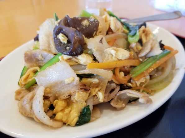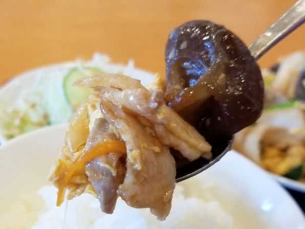 さぁ気になるお味です。。。具材はきくらげ、豚肉、玉ねぎ、人参、青菜、、、それらが玉子と一緒に、オイスター系のようなソースで炒められています。。。きくらげのプルプルんっ食感がGOOD!!