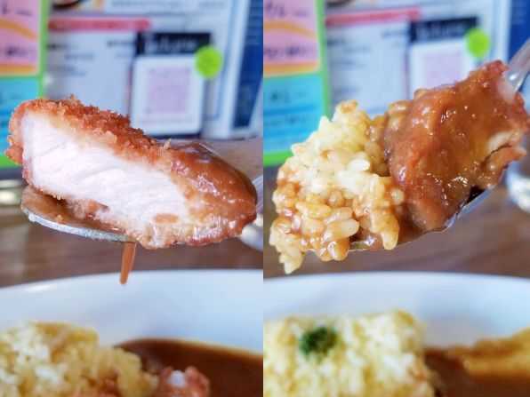 さて気になるお味は、前々回に食べていますので、 そちら をご参照ください。。。サクサクの衣を纏った身・筋・脂の三位一体構造の豚カツに、、、酸味と甘み、そしてスパイシーなルーが絡みます。。。うんうん、旨い旨い~☆