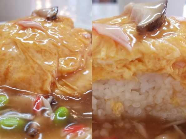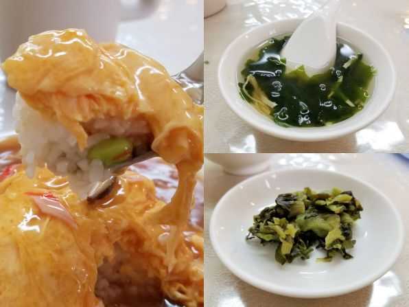 さぁ気になるお味です。。。フワフワの芙蓉蛋(オムレツ)がライスに被せられ、餡の方には蟹の身や干し椎茸、グリンピースなどの具が綴じられています、、、具だくさんで見た目も楽しい"天津飯"でしょう。。。また餡は蟹と椎茸のエキスと風味が良い醤油味、、、餡もしっかりトロトロ~~っ!! うんうん、旨い旨い~☆