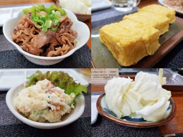 [おや鳥のポン酢づけ、だし巻き、ポテサラ(つき出し)、]