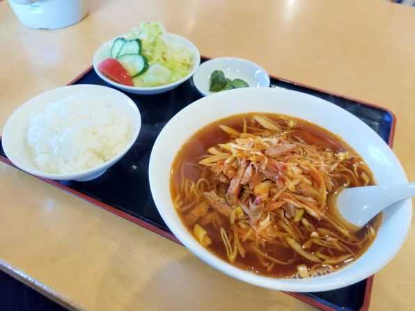 午後1時半頃に入店すると、店内には2組のお客さんです、、、私は空いていたテーブル席に着き、"冷麺"を聞いてみました。。。でもやはりまだ始まっていないそうです、、、なので"本日のランチ(ネギソバ/小ライス・サラダ)"をお願いし、待つこと約7分でできあがりです。。。