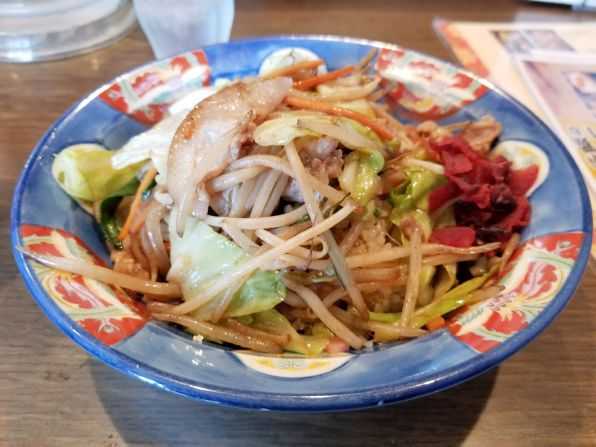 さて何度も書いていますが、気になるお味です。。。しっかり強火で炒められ、そのままでも十分美味しい炒飯の上に、タップリの野菜炒めがトッピングされています、、、その野菜炒めの具材は、モッチリ食感の豚肉、キャベツやもやし、人参、ネギなどなど。。。程よいパラパラ炒飯に、野菜のシャキシャキ感が絶妙なアクセントです!! うんうん、旨い旨い~☆