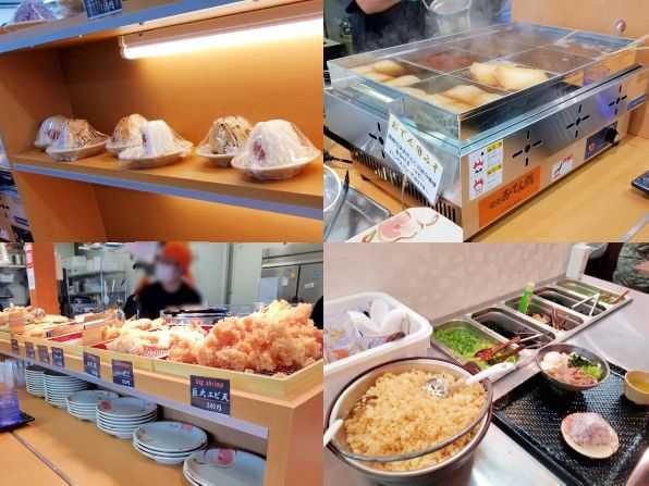形態はセルフなので、最初に"おにぎり"を取って、看板にもなっているイチオシの"肉温玉ぶっかけうどん(小)"を温でお願いし、、、、会計して、天かす、ネギ、ワカメをトッピングして席に着きました。。。