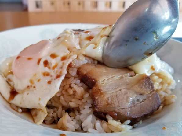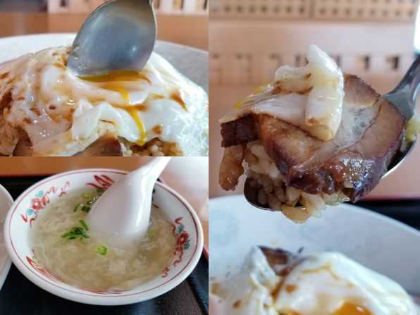 さぁ気になるお味です。。。まず玉子の下の焼豚は、小さいながらも切れ端でなく、枚数も少なめですが一枚物、ややモッチリとした焼豚です、、、で、玉子を潰し、焼豚とご飯に絡めていただきます。。。