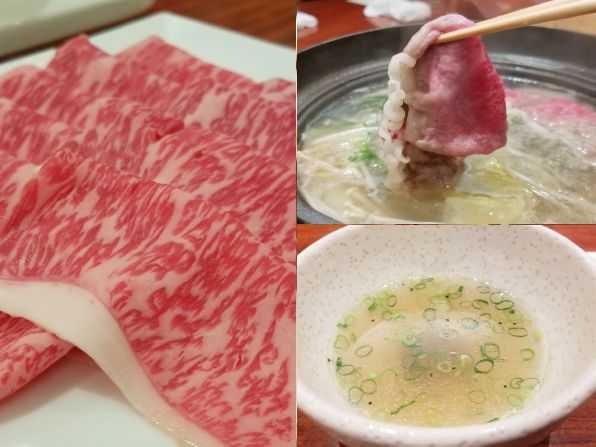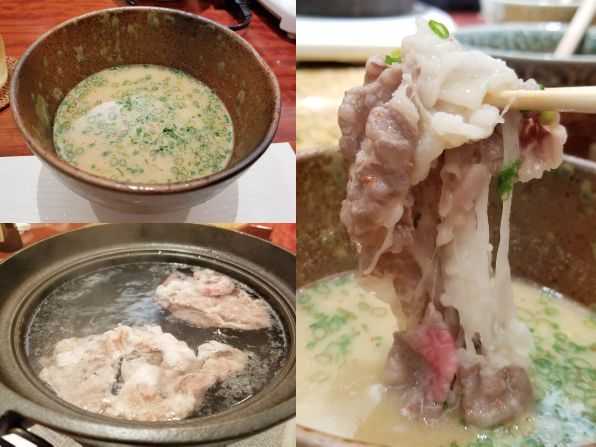 やがて満を持して"しゃぶしゃぶ"が出て来ました、、、うんうん、この霜降り具合に心が躍ります!! その霜降り肉をグツグツのお湯でしゃぶしゃぶ、、、茹ですぎはダメダメです、、、程よいピンクの色が残っているくらいで、"秘伝のたれ"にくぐらせいただきます。。。おおぉぉぉ、、、トロけるトロける~~っ!! 甘い甘い~~っ!! うんうん、旨い旨い~☆